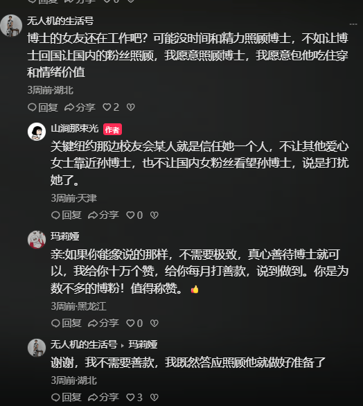 还有一个55岁湖北的大姐看来很喜欢孙卫东,她说:博士的女友还在工作吧?可能没时间和精力照顾博士,不如让博士回国让国内的粉丝照顾,我愿意照顾博士,我愿意包他吃住穿和情绪价值。
