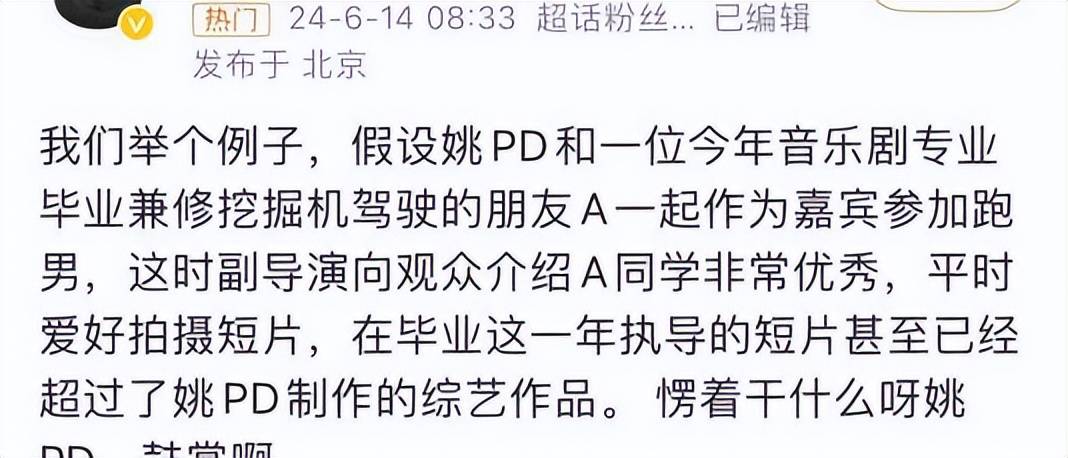 甚至还有粉丝举例:姚译添和一位今年音乐剧专业毕业兼修挖掘机驾驶的朋友A一起参赛,这时副导演介绍A很优秀,平时爱好拍摄短片,在毕业一年执导的短片甚至已经超过了姚PD制作的综艺作品,不知道姚PD是啥感受。