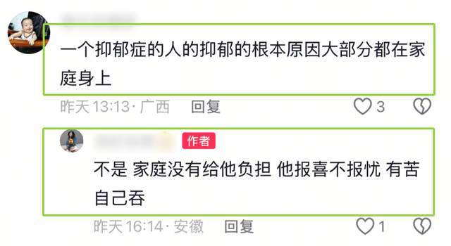 至于其患上抑郁症的原因,可能与其性格有关系,当然还有其他的因素,这一点从其妻子的长文中就可以看出。