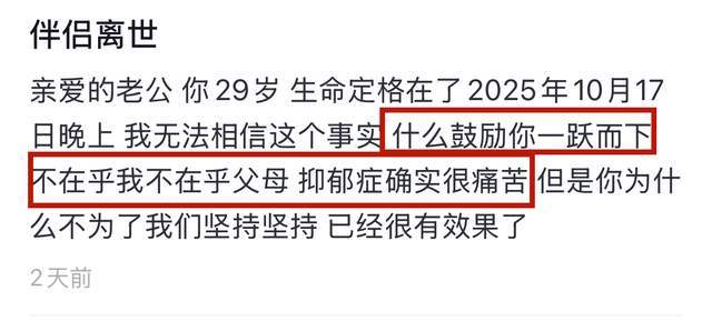 关于其去世的原因,杨高耸的妻子在18号的时候就曾发文,虽然没有详述细节,但她说了一句话语:我无法相信这个事实,什么鼓励你一跃而下不在乎我,不在乎父母,抑郁症确实很痛苦,但是为什么不为了我们坚持坚持,已经很有很有效果了。