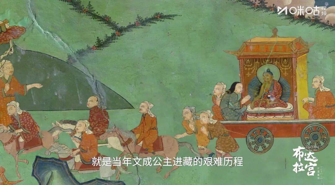 更具代表性的叙事升维,发生在白宫门庭的壁画前。1000年后,随着白宫落成,松赞干布与文成公主的故事被描绘在了白宫门庭北面的墙壁上,更多的历史往事才直观地呈现在人们眼前,例如禄东赞如何以超凡智慧破解唐太宗“五难婚使”的传奇故事。