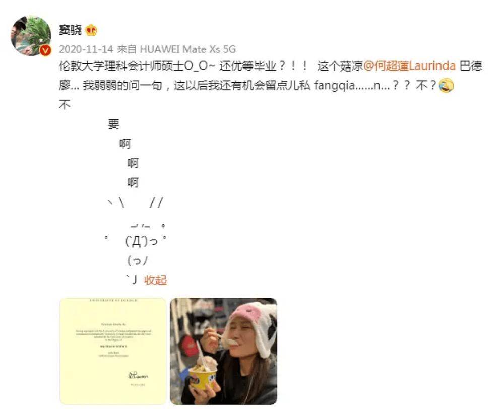 窦骁晒何超莲伦敦大学理科会计师硕士毕业证,字里行间这个骄傲,还不忘调侃一句“以后我还有机会留点私房钱不?”(这个颜文字真的很古早了)