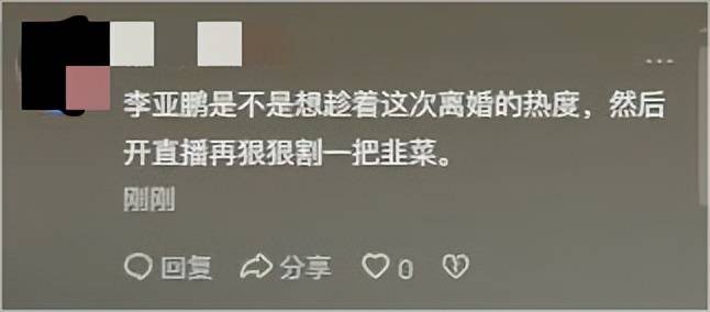 还有网友表示,李亚鹏是不是想趁着这次离婚的热度,然后开直播再狠狠割一把韭菜。