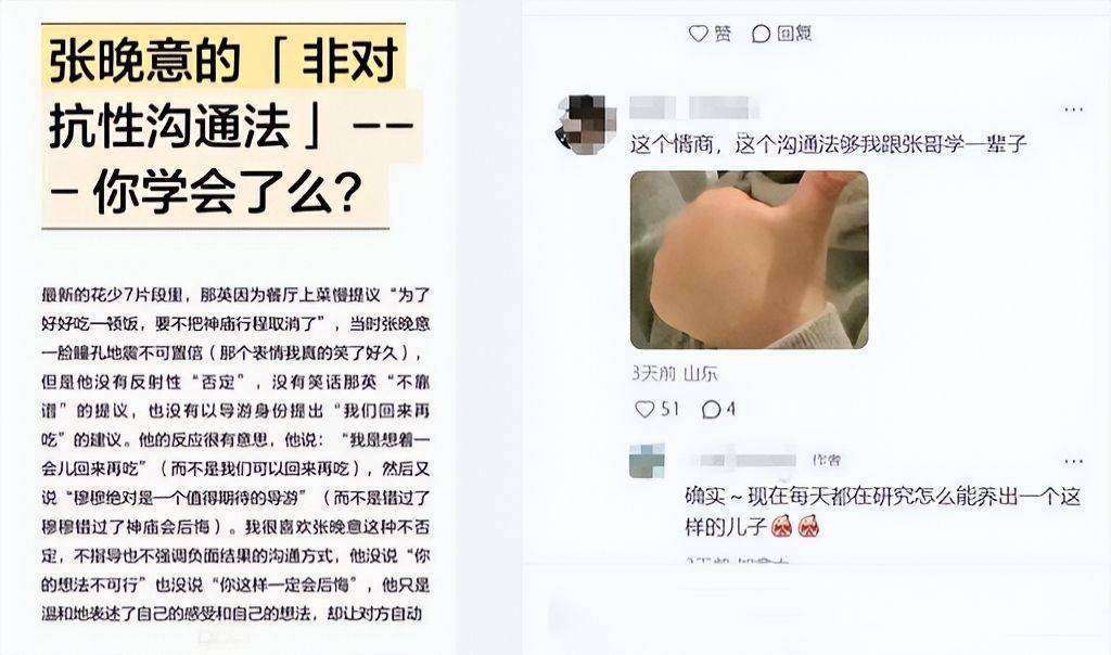 不过别急着把张晚意封为沟通大师。这套方法放在其他综艺可能完全行不通,比如奔跑吧里李晨撕名牌时要是来这套,估计会边撕边问"现在能听我说话了吗?"可见节目规则才是关键。花少作为旅行综艺,天然需要展现团队和谐,这给了温和沟通生存的土壤。