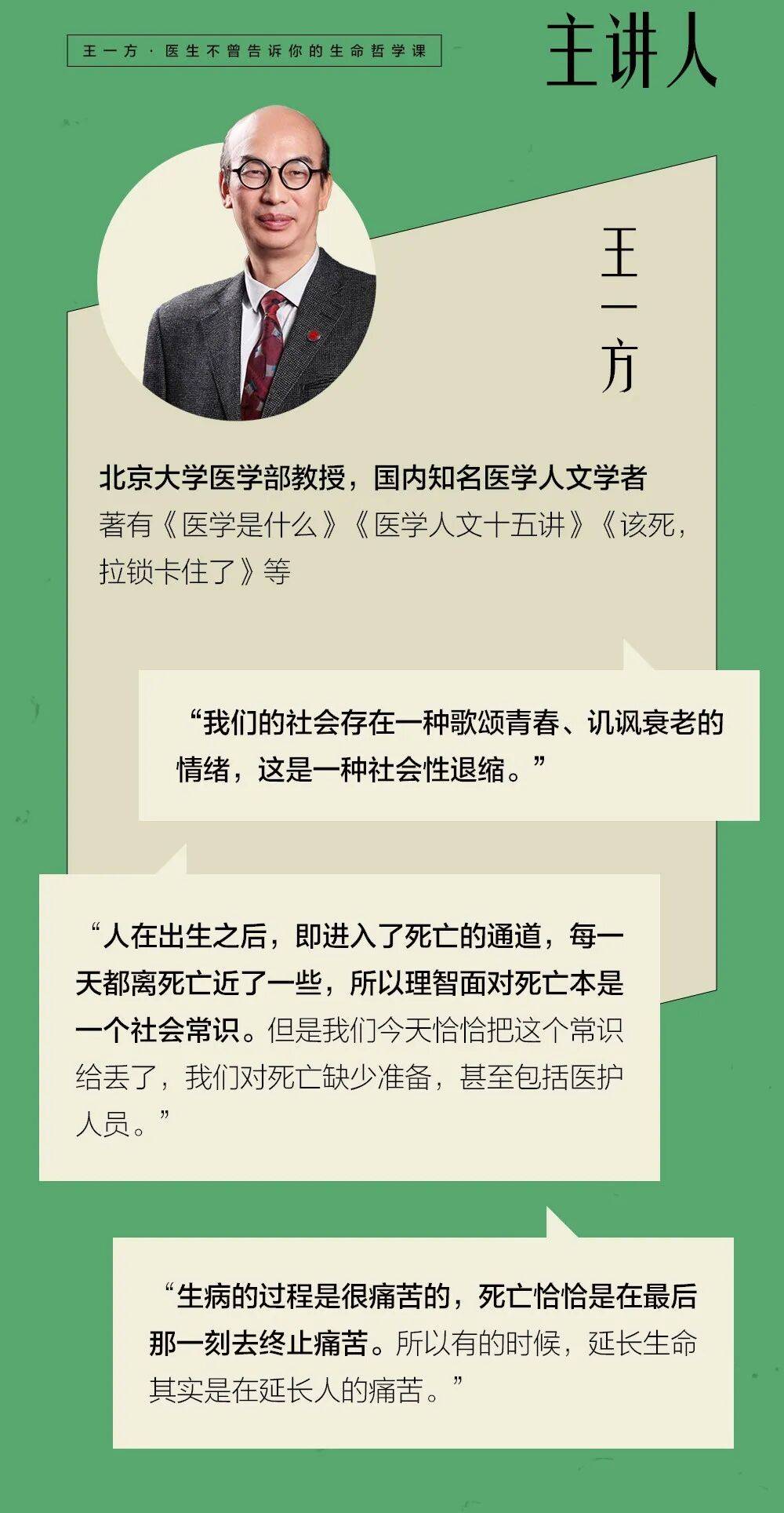 因此,《王一方·医生不曾告诉你的生命哲学课》,会从衰老、疾病和死亡这三个维度出发,关照与你息息相关的重要议题: