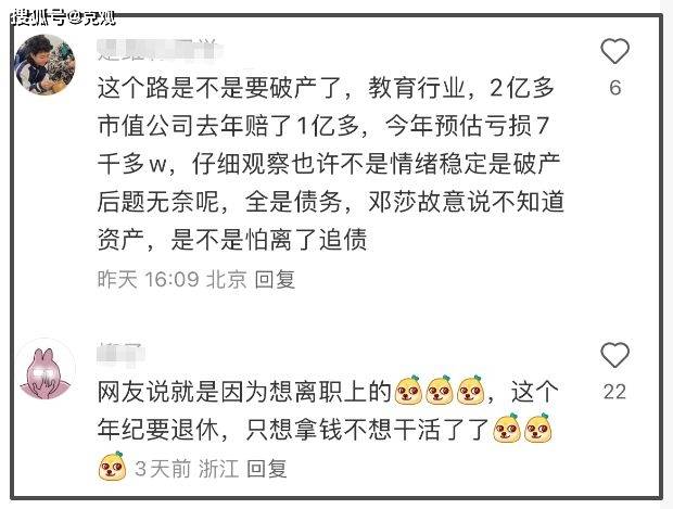 网友扒出路行公司市值2亿多的公司,去年赔了1亿多,今年预计亏损7000多万。猜测他或许是因为想圈钱才上综艺,情绪稳定也不是因为财富过人而是破产前的无奈。至于邓莎之所以说不知道路行的资产,则是知道对方的经济情况,担心离婚后被追债。
