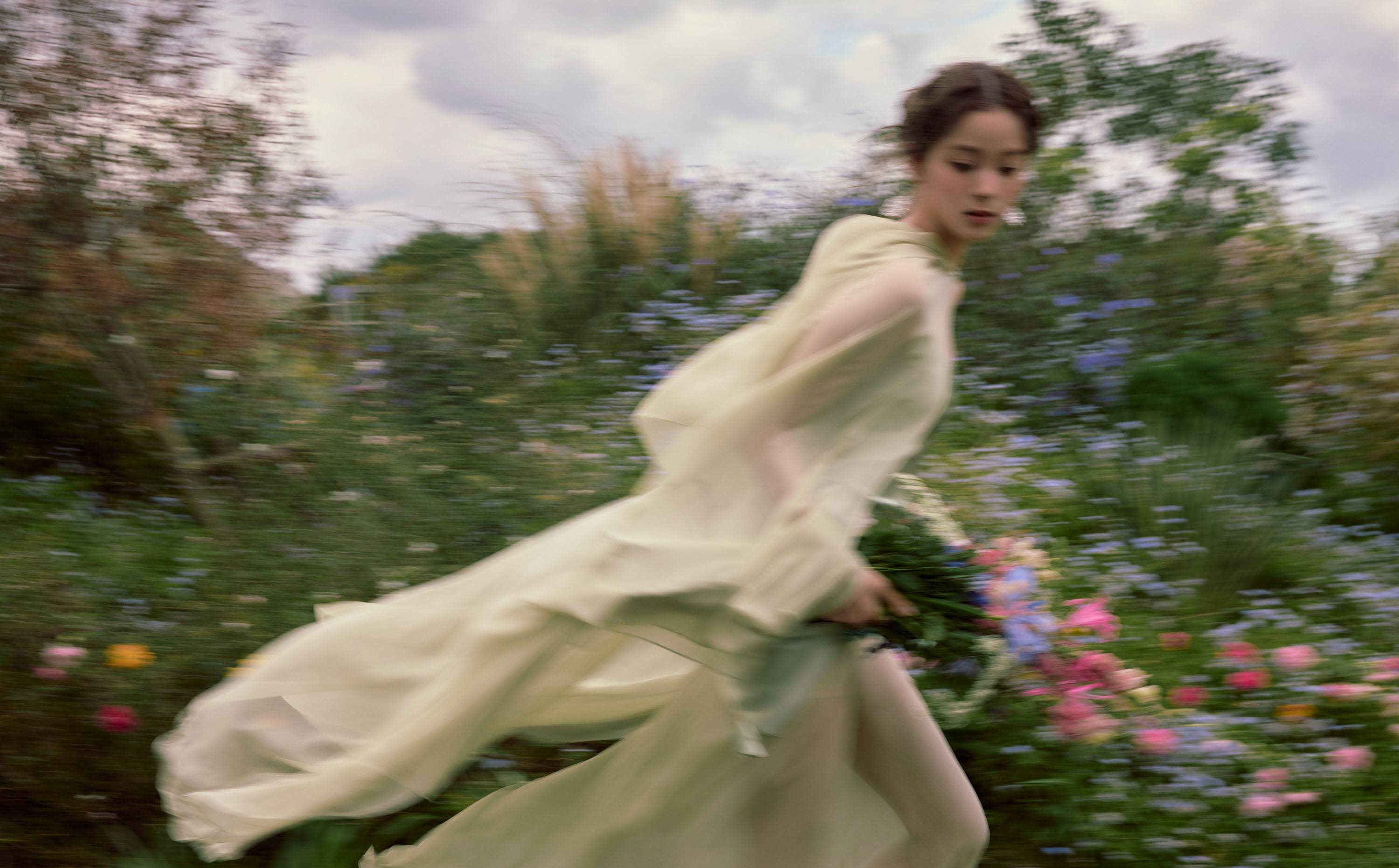 欧阳娜娜手持花束在花海中奔跑,灵气十足。