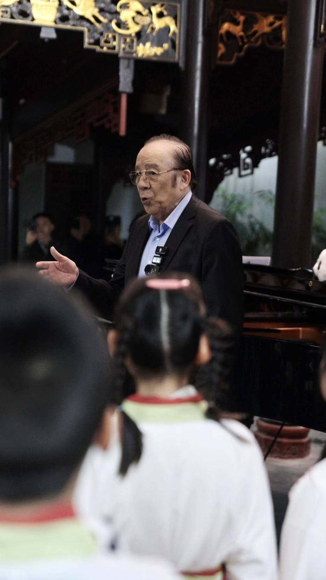 活动开场,孩子们在老师在带领下在升庵书院吟诵《临江仙·滚滚长江东逝水》,清脆的嗓音与古老的词句交织,仿佛唤醒了沉睡的历史。当杨洪基从人群中缓步走出,接过歌声唱起“滚滚长江东逝水”时,现场气氛达到高潮。他醇厚恢弘的嗓音,与湖光祠影、参天古木融为一体。现场观众纷纷举起手机,不少观众轻声跟唱,激动之情溢于言表。