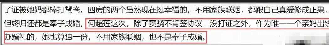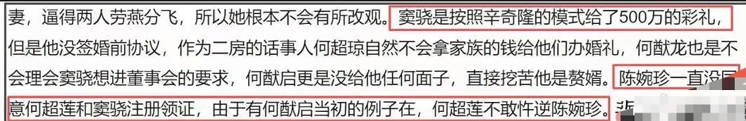 这可把何超莲急坏了,无奈之下,她只好去求自己的亲妈三太陈婉珍。陈婉珍实在拗不过女儿,掏钱给小两口办了婚礼。但这个爆料版本里还说,窦骁只掏了500万的彩礼,也正是因为这个缘故,三太不同意窦骁和何超莲领证。按照这个说法,窦骁一门心思想当赘婿,还不老实想要掠夺何家的家产,而何超莲只是个单纯的傻白甜恋爱脑,被窦骁耍得团团转。