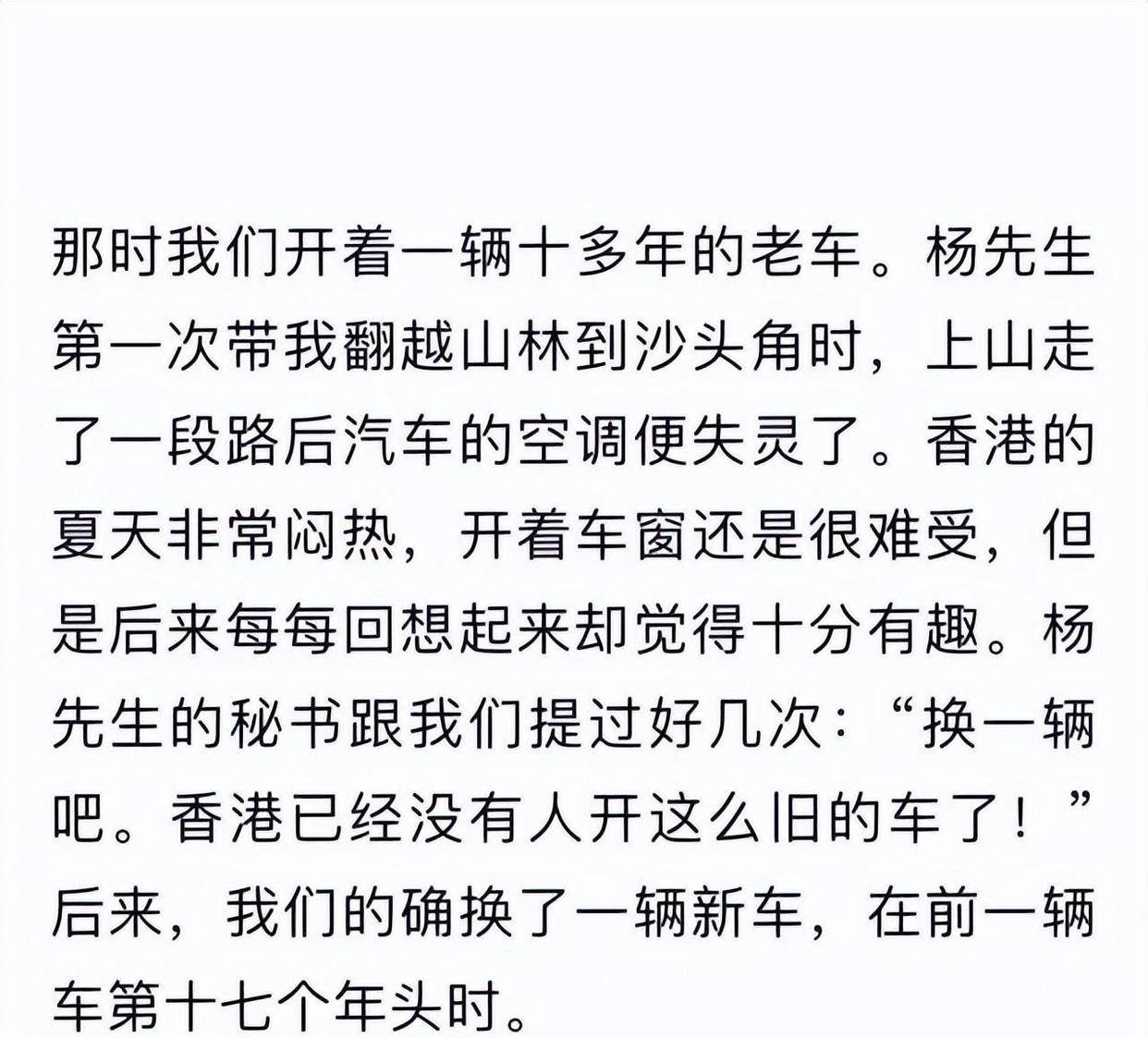 据翁帆描述,杨老不喜欢奢华虚浮之物,同一辆车他开了十几年。有一次在香港沙头角,车子的空调突然出故障了,那时正值夏天,他们只好把车窗打开来乘凉。