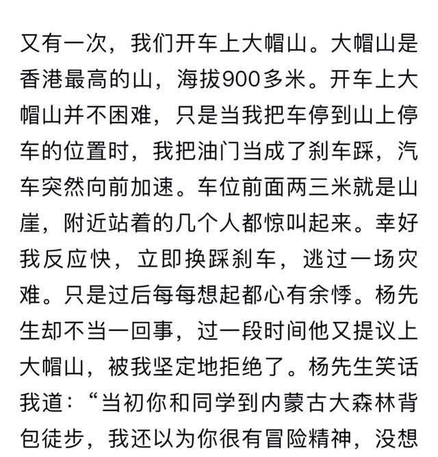 在长文首段,她这样写道:直到85岁,杨先生才将开车之事交由我负责,此前他一直热衷于驾车。