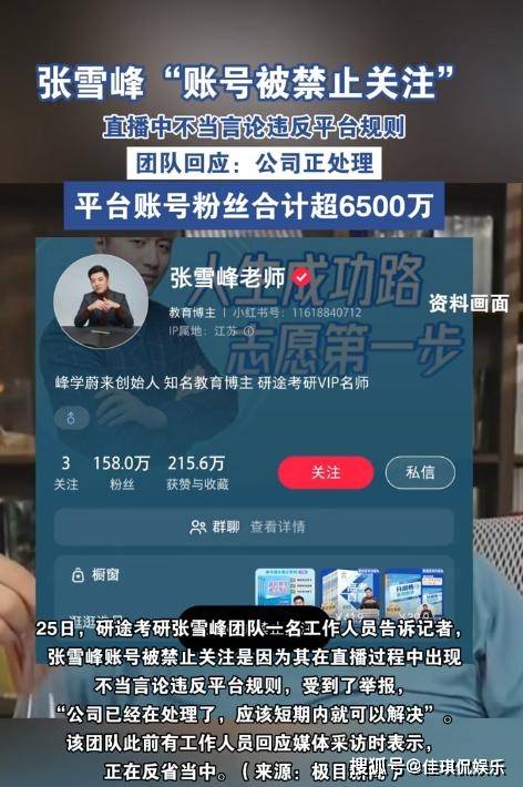 而面对封禁,张雪峰回应“禁止关注是账号问题”,团队则表示“正在反省,因不当言论违反平台规则”。