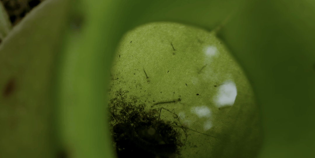 一旦昆虫落入膨胀凸起的笼腔,被浸在充满消化酶的液体中,就会被慢慢分解,成为猪笼草的盘中餐。
