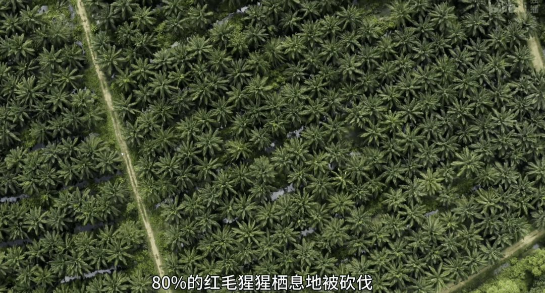 原始雨林突然让位给了人类种植的棕榈树,这使得80%的红毛猩猩栖息地被砍伐。