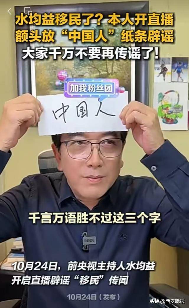 据@上游新闻,10月24日,前央视主持人水均益开直播时,额头放“中国人”纸条否认移民传闻,请大家千万不要再传谣了。
