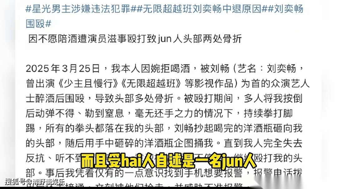 事情远比“耍酒疯”要严重得多。爆料里说,他在酒桌上,仗着自己是个演员,非要逼一个同桌的男生喝酒。对方不喝,然后就被打了。这不是简单的口角推搡,而是刘奕畅喊上好几个人,把那个男生围起来打。被打的,还是一位军人。