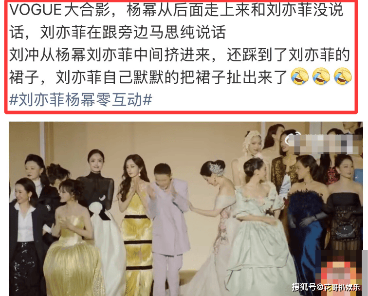 其实这次vogue盛典一开始就办的挺波澜起伏的,今年是vogue创刊二十周年,刘冲想整个大的,因此邀请了好几位大花撑场子,还有中花装门面,结果刘亦菲这边靠着干爹截胡,不仅要参加,而且明确说她要C位。这就意味着所有的大花中花都要给她当陪衬,人家自然不干,之前谈好的章子怡、辛芷蕾等人都直接推了,杨幂本来也不想来,实在是和刘冲有交情,刘冲找上门来她抹不开面,才答应去的。也正是如此,刘冲才会在合影期间上台端水,毕竟杨幂是冲着他的人情来了,他不能让杨幂下不来台。