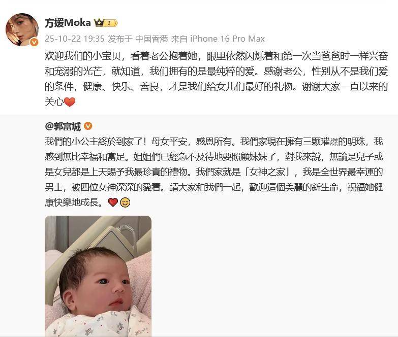 眼看舆论愈演愈烈,郭富城和方媛夫妇也分别发文澄清,说明“性别无关,是男是女都是我们的宝贝。”