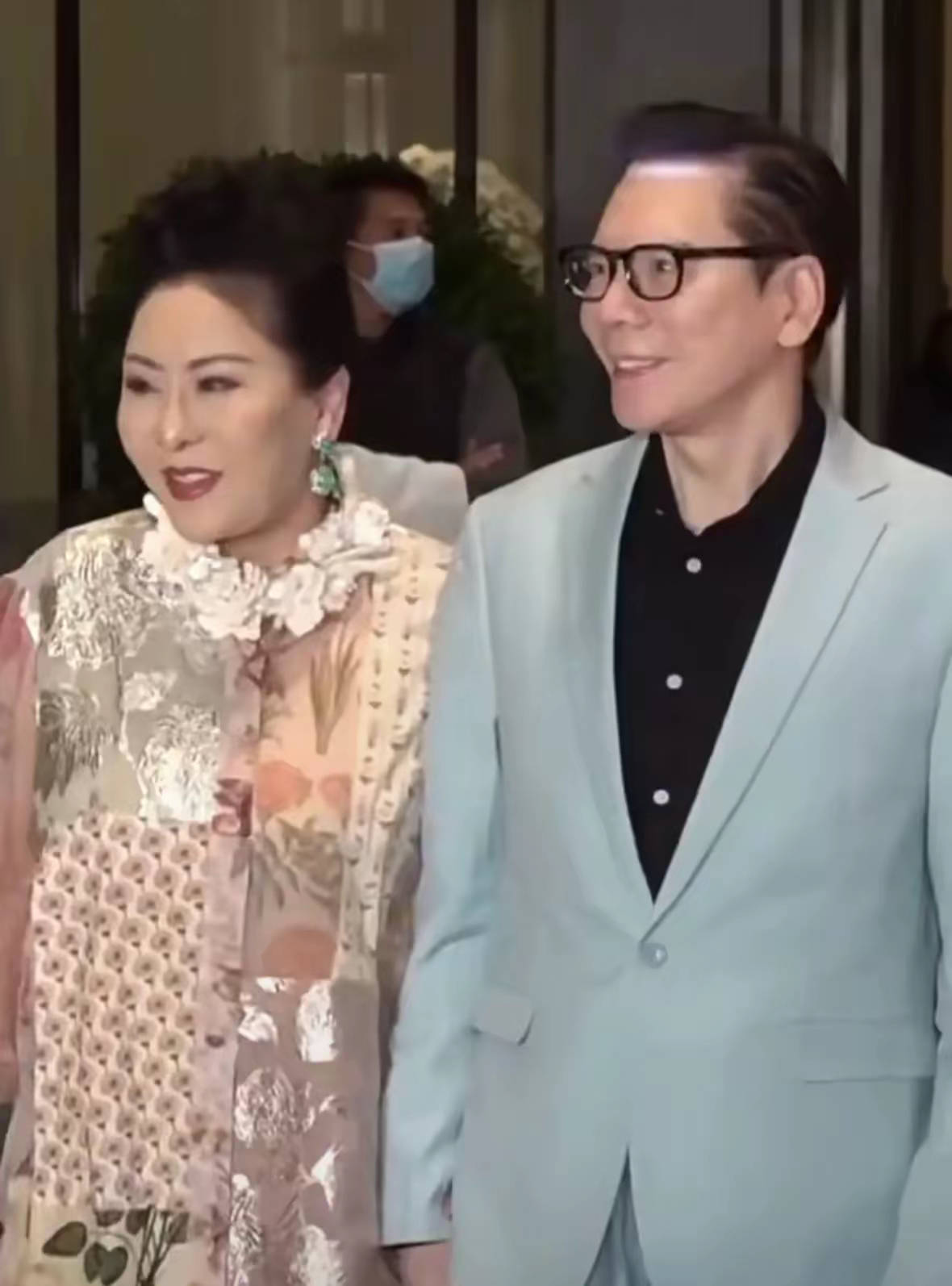 向太打扮的很贵气,穿着宫廷风的连衣裙,戴着华丽的宝石耳环。向华强还是一如既往的帅气,浅灰色西装、黑色衬衫,更显精神。