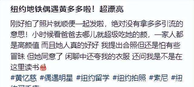 不久前,有网友在纽约地铁站碰到了黄多多。照片显示,她背着书包,肩带斜搭在肩上,显然还是学生身份。眼皮微微耷拉,显得有些疲惫,好像前一晚熬夜学习到很晚。脸上也冒出了青春痘,这也是她在大学时期典型的成长印记。