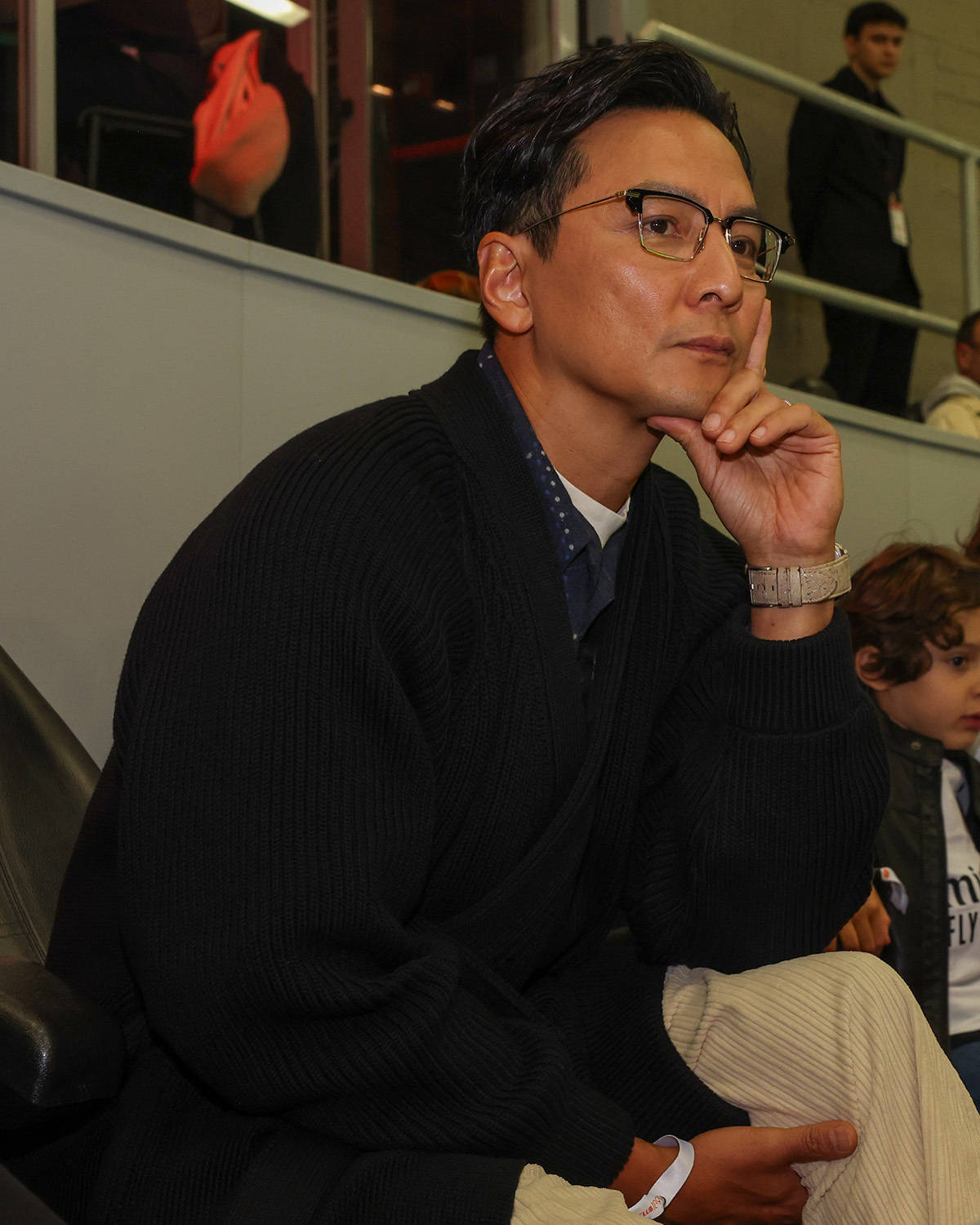 吴彦祖在观众席看比赛,神情专注。