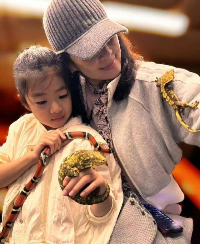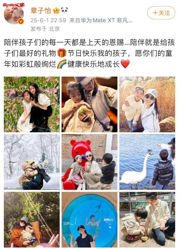 六一儿童节,她晒出带两个孩子去游乐场的照片,蹲在地上陪孩子喂小动物,完全就是一个普通母亲的样子。