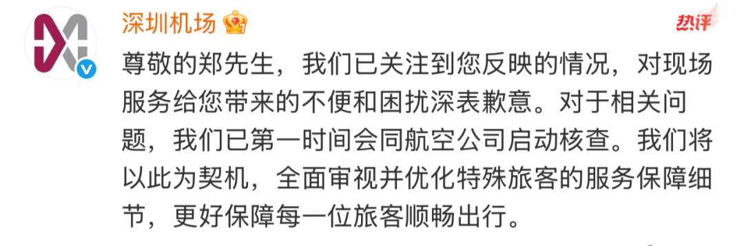 10月25日晚,深圳机场发布通报称,对郑智化反映的情况,机场高度重视,联合航空公司对现场保障情况快速进行了核实。