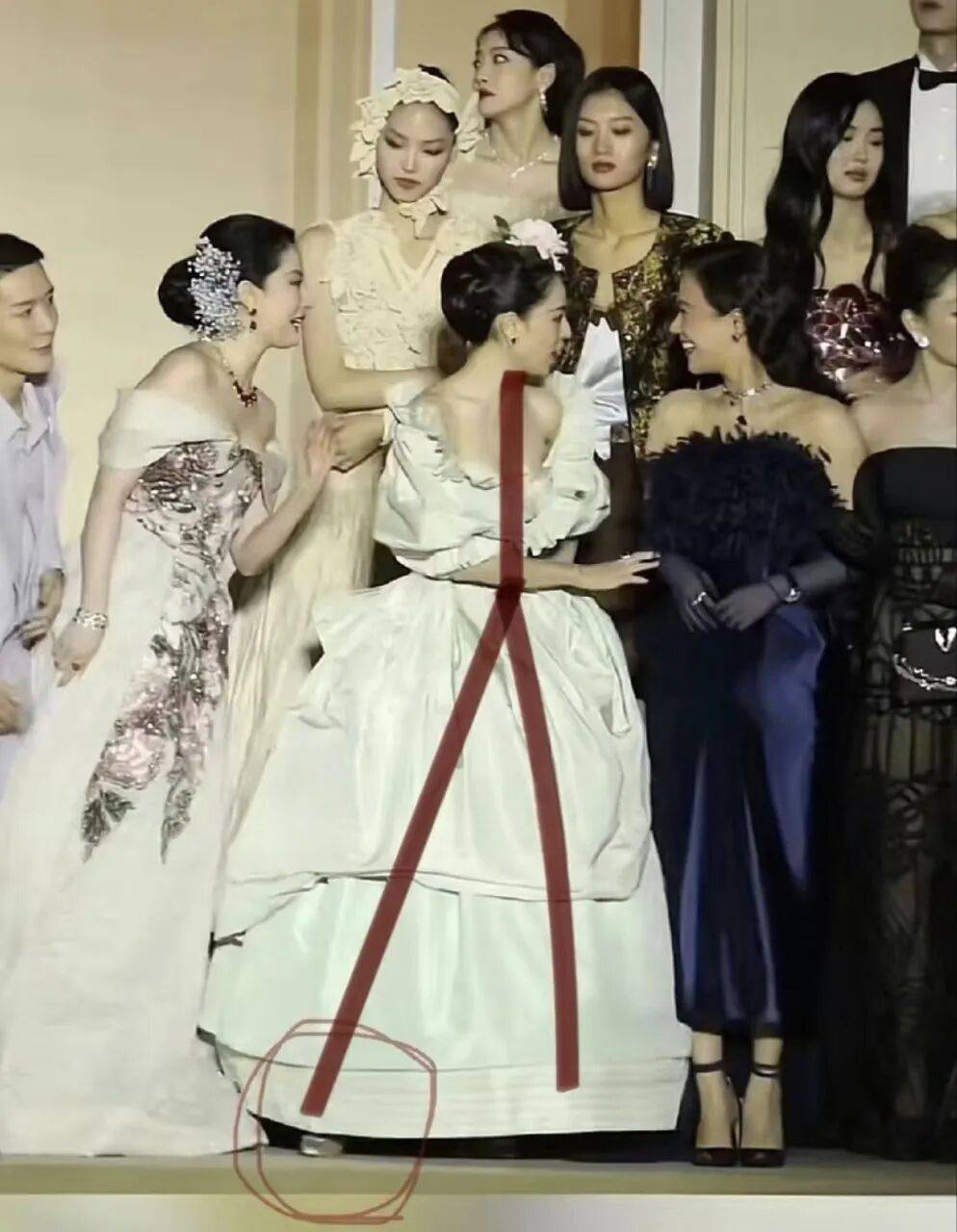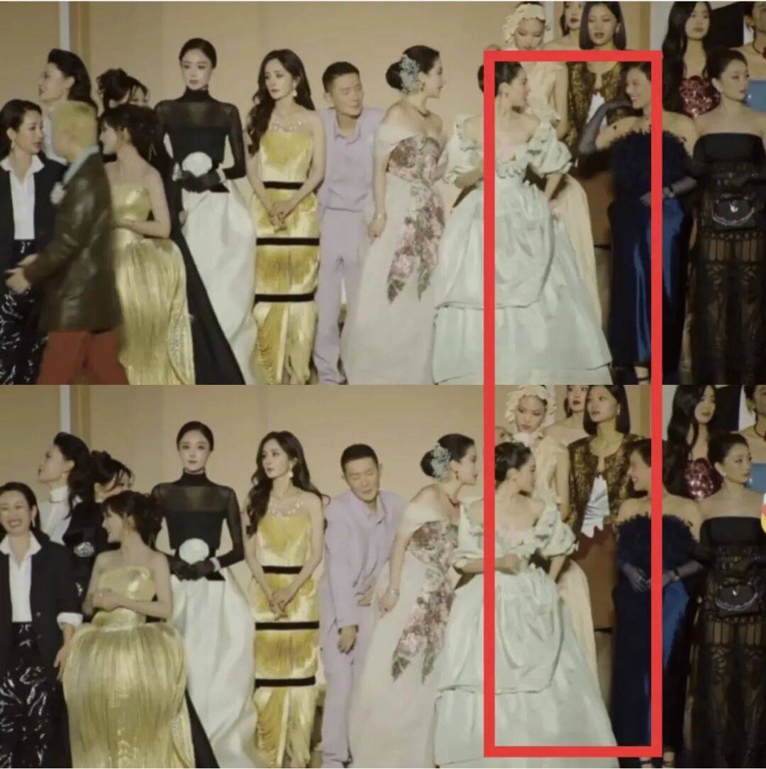 刘亦菲,杨幂,娜扎和刘冲中间挤的要命,杨幂娜扎肩膀都没伸展开,刘冲还被挤得踩了天仙的裙子,一边挤的要死就她独美,网友能不生气嘛?