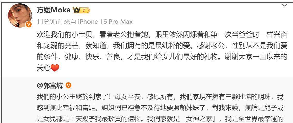 更打脸的还在后面。 仅仅几小时后,郭富城微博晒出三胎正面照,新生儿戴着蕾丝蝴蝶结软帽,眼睛大得像年画娃娃。 他写的是:“我们家的女神之家正式成立! ”而方媛的转发更直接:“性别从不是爱的条件,健康快乐才是。 ”这两句话,分明是对持续数月的“追生儿子”传闻最干脆的回应。