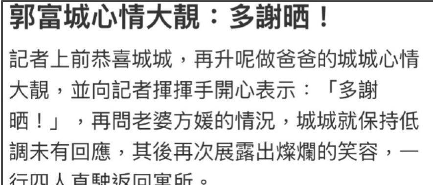 这种家庭形象的建立早有端倪。 2023年他带大女儿看赛马,小姑娘穿着定制骑士装,被拍到对着镜头比“耶”;2024年方媛怀三胎期间,一家四口被拍到在浅水湾散步,两个女儿轮流摸妈妈肚子。 这些画面比任何公关文都更能说明问题:当很多人还在用“追生儿子”的旧剧本编故事时,郭富城家早已排演好了“女神之家”的新剧集。