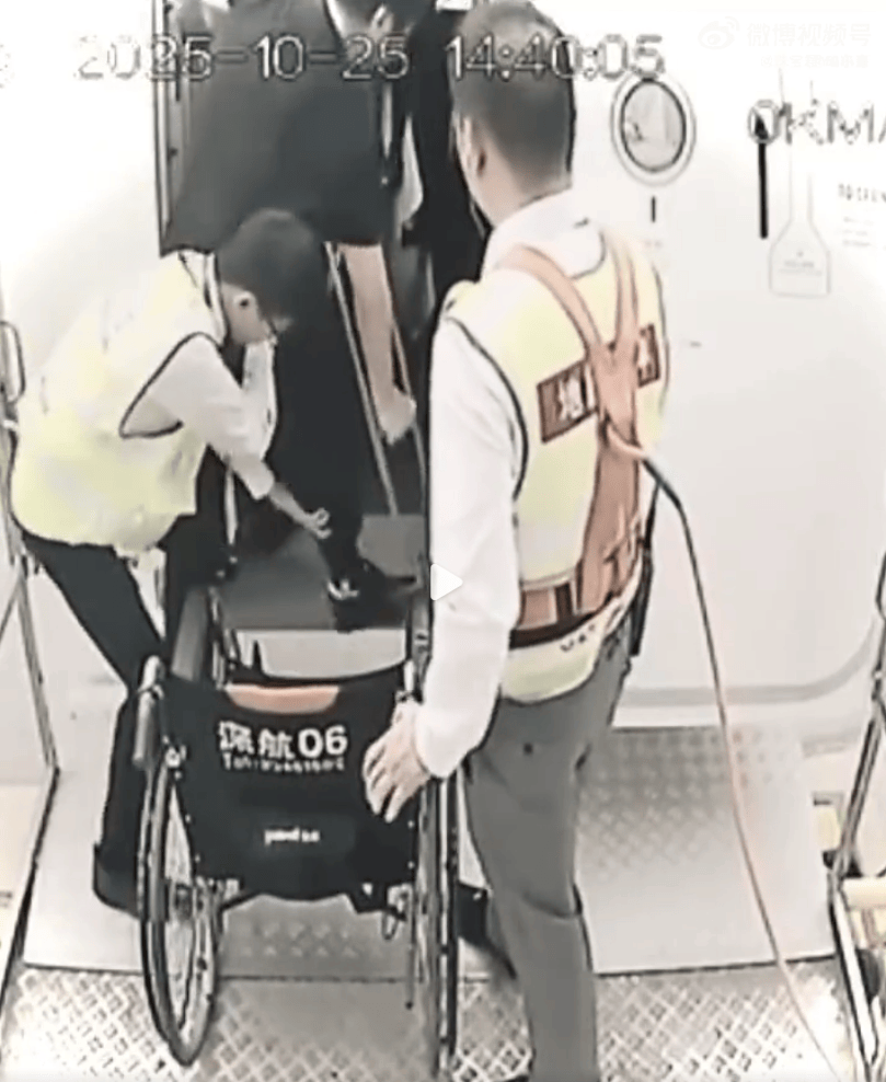监控画面记录了郑智化登机完整过程,地勤人员将坐在轮椅上的郑智化推至机门,随后和空姐一同搀扶郑智化站立进入机舱。