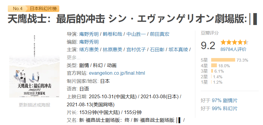 这部剧场版又名《新福音战士剧场版:终》,2021年在日本上映,豆瓣评分9.4分。