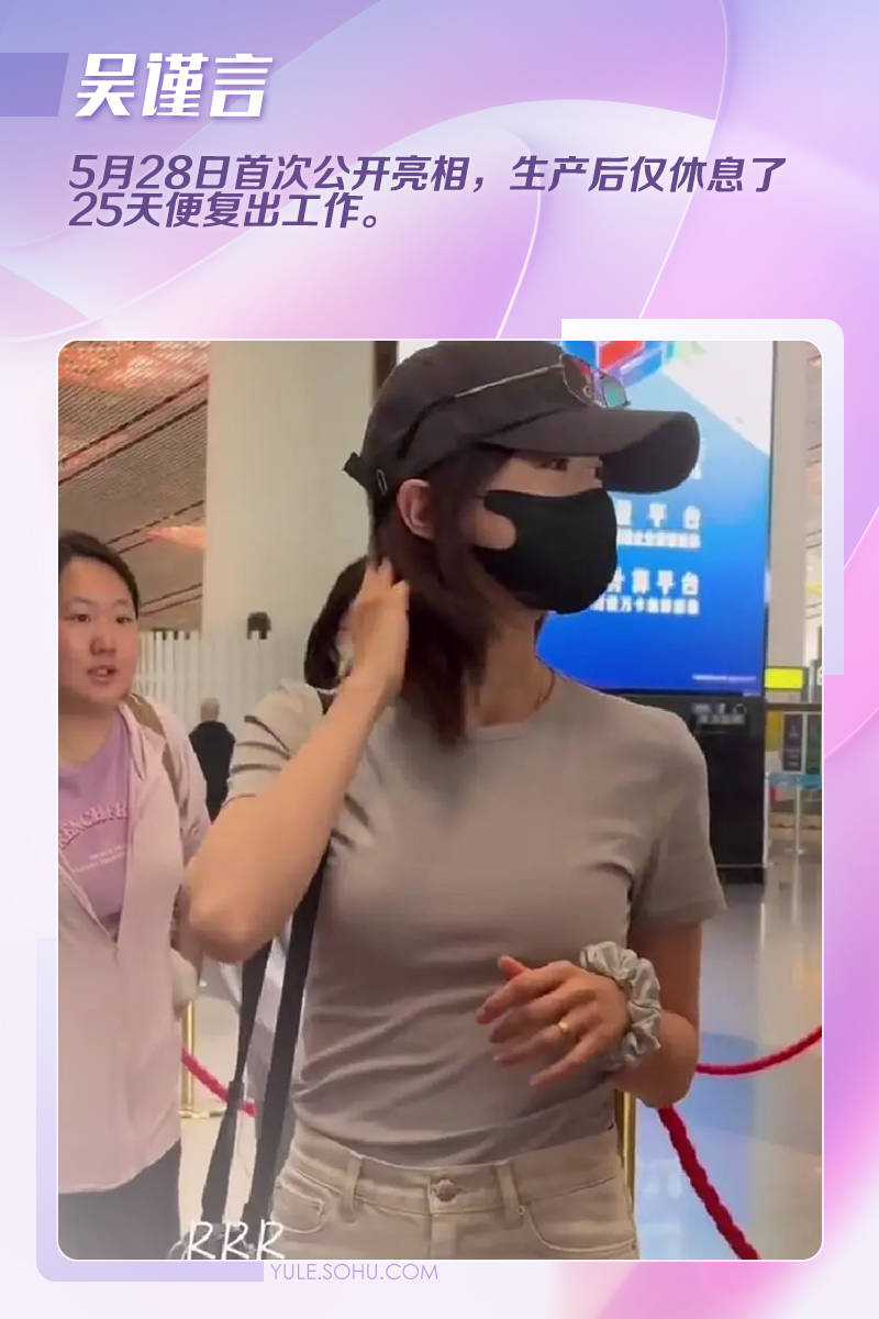 同样在今年当上妈妈的吴谨言,首次现身时也非常惊艳。在仅仅休息35天后,吴谨言就现身机场参加时尚活动。只见她身穿紧身灰色短袖,双臂纤细,腰肢也丝毫没有赘肉。在机场,她不断和很久不见的粉丝打招呼,完全没有生娃的疲惫感。