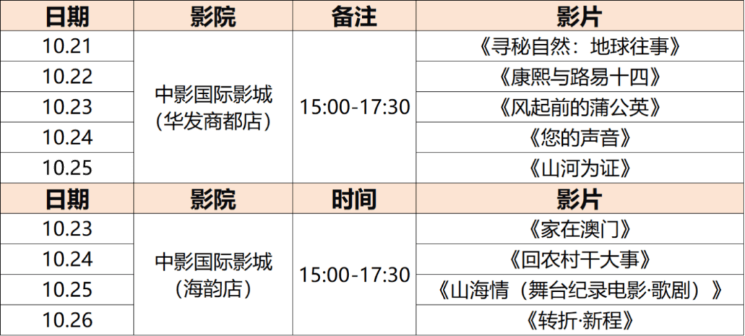 作为大会配套活动,华语纪录电影展映活动将于10月21日至10月27日举行,活动覆盖珠海多家影院与公共文化场所。