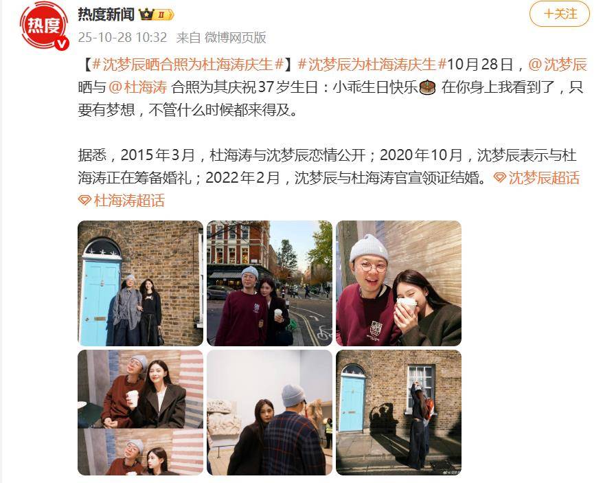 10月28日,沈梦辰一条微博准时为杜海涛送上37岁生日祝福,配文“小乖生日快乐,在你身上我看到了,只要有梦想,不管什么时候都来得及”,瞬间冲上热搜。