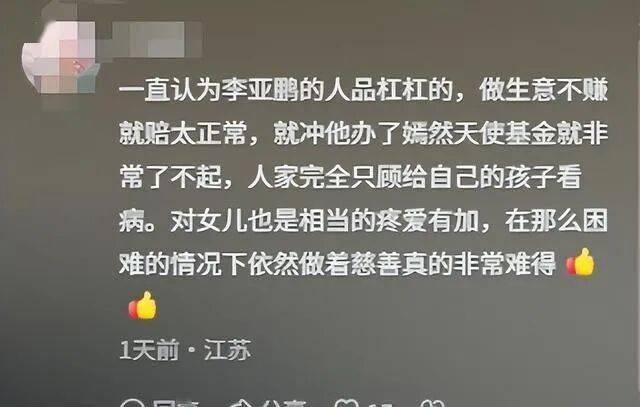 李亚鹏这次离婚不仅没被骂,反而收获了 “纯爷们” 的赞誉,核心原因离不开他的 “困境人设”。公开信息显示,他名下 9 家关联公司 7 家有风险,丽江项目更是亏了 4.6 亿,有网友算过,就算年利润 3000 万,也得还 15 年以上。“负债累累时选择离婚,不拖累老婆孩子”,这样的解读让网友集体共情,直言 “比死撑空壳婚姻有担当”。再加上他 20 年的公益积累,和王菲一起创办的嫣然天使基金帮助了无数唇腭裂儿童,这份 “公益滤镜” 让舆论对他格外宽容。更难得的是他的 “好父亲” 形象,不仅把曾因唇腭裂自卑的李嫣养得自信大方,还和继女窦靖童保持着融洽关系,离婚 4 年后仍能同框出席活动,这份分寸感圈粉无数。离婚当天,他坚持直播带货的样子更被赞 “敬业”,而李嫣 30 秒的露脸一句 “喝过放心”,直接让销售额飙到 2300 万,父女俩的双向奔赴成了口碑加分项。