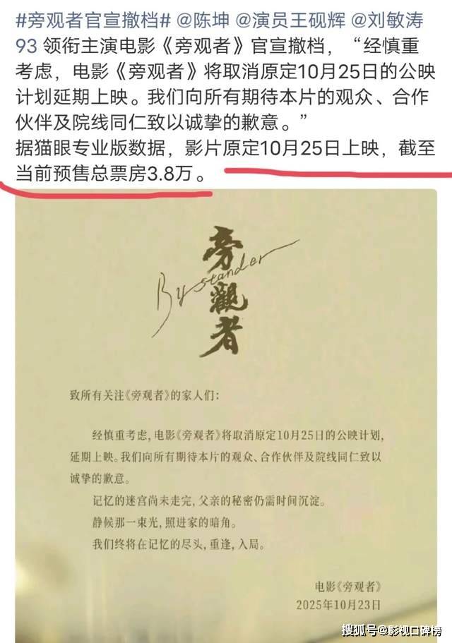另一边,陈坤的《旁观者》倒是几乎零宣发。定档后没有路演,没有大规模的媒体投放,社交平台悄无声息,发行公司也缺乏商业院线资源,导致很多观众根本不知道这部电影上映了。粉丝这两天都炸锅了,认为如果宣传给力,结果必定不同。但仔细看看,就算陈坤和黄晓明一样卖力宣传,最终都指向了同一个结局,失败。