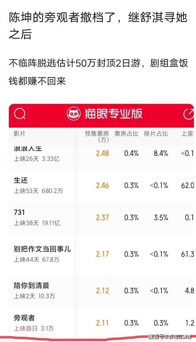 老对家陈坤的处境更为尴尬,新片《旁观者》甚至连正式上映的勇气都没有,因为点映和预售总票房还不到4万元,首日排片占比低至可悲的0.3%,最终片方紧急撤档以求日后生机。