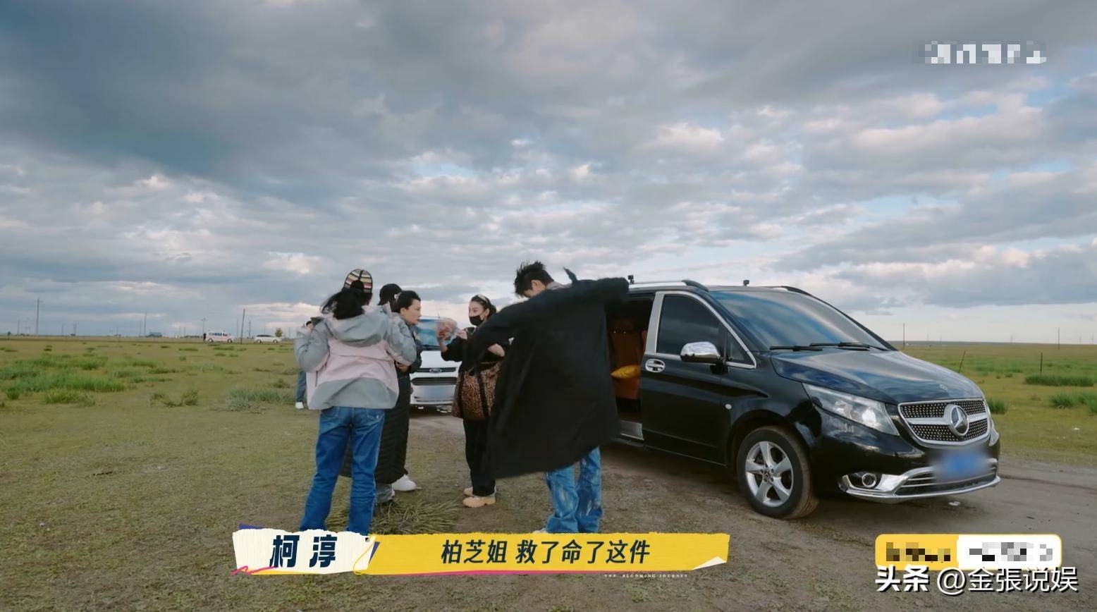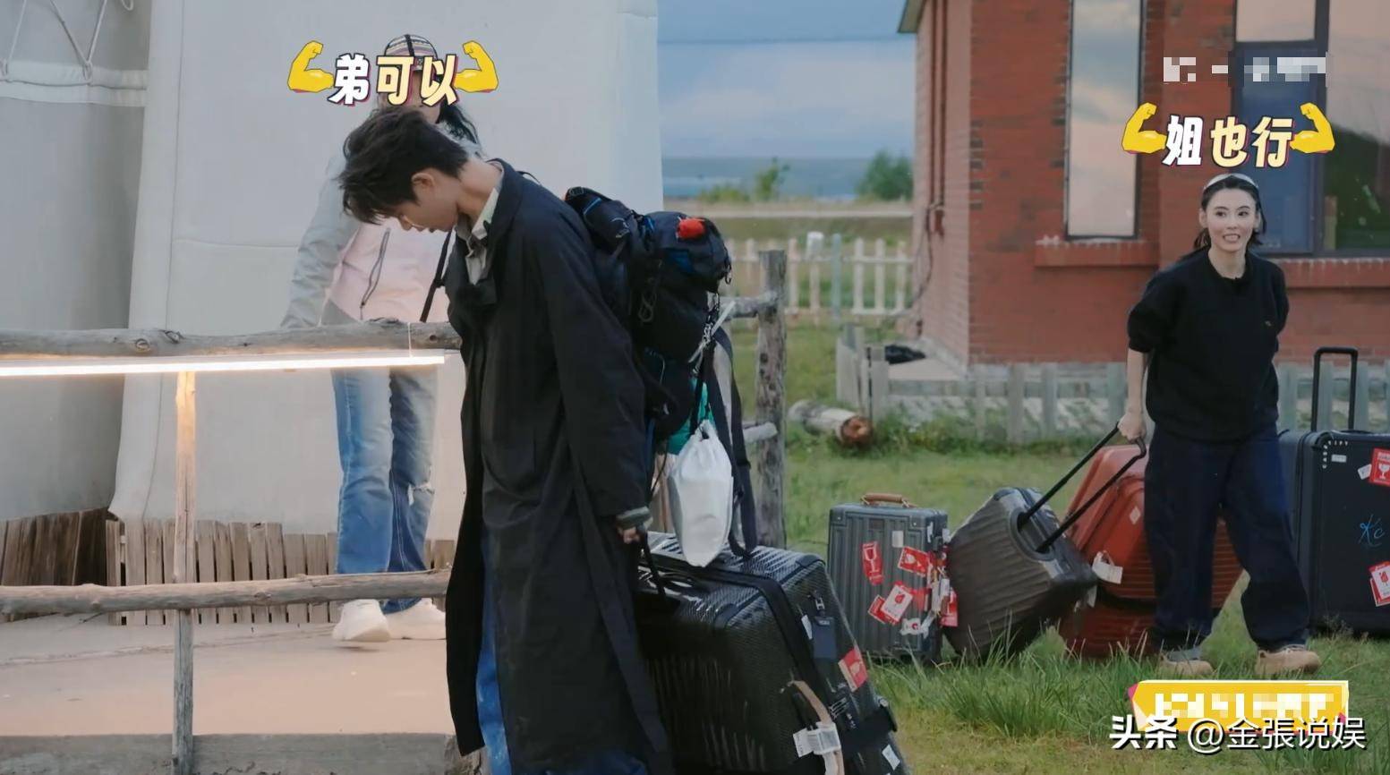 其他嘉宾在那边聊天休息,她一个人默默把大家的箱子一个个搬下车。