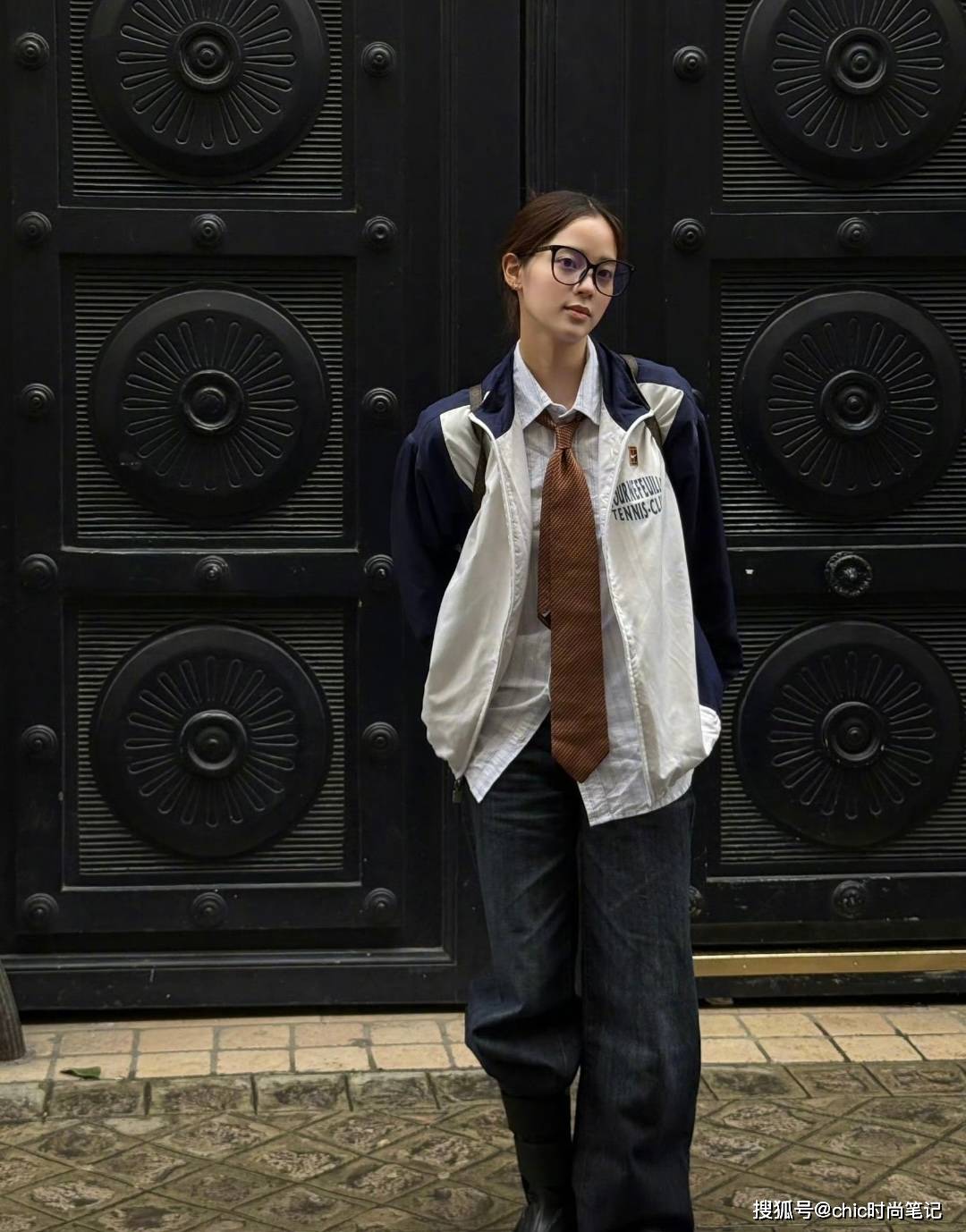 白色衬衫+领带就很有学院气息,叠穿运动风黑白拼接外套有传统校服的感觉,休闲又防风,配上双肩包和黑框眼镜有乖乖女高的既视感。