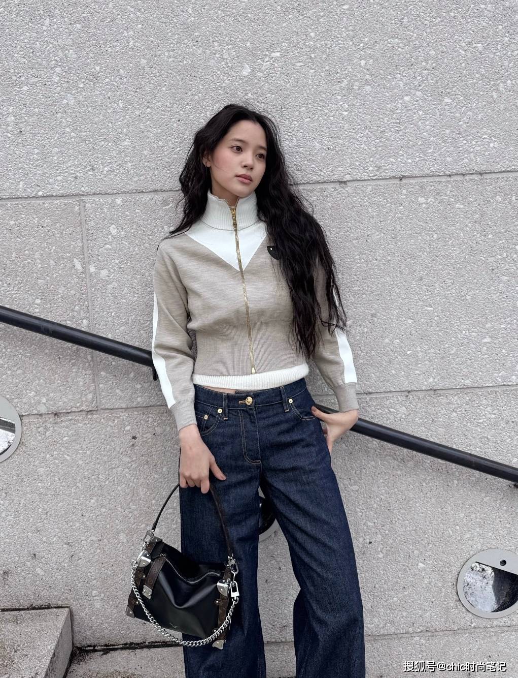 白色与卡其色拼接针织外套,腰间处做了收腰设计,打造小蛮腰效果,搭配牛仔裤和金属朋克包包,自信且张扬。
