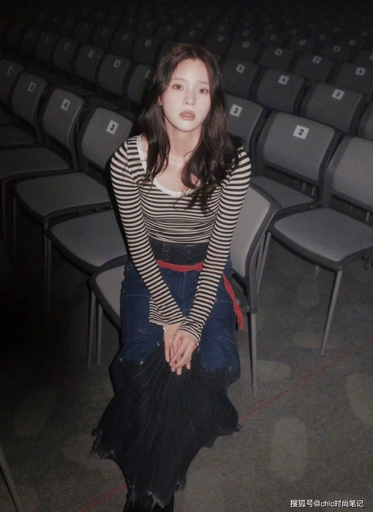 较为紧身的条纹U领T恤配上拼接款牛仔长裙,非常吃氛围感的一套look,但好在日常和基础,不论是单穿还是叠穿外套都能很好搭配!