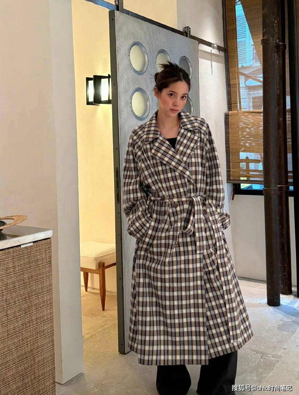 超长款格纹风衣摩登感十足,一般来说不会大面积运用格纹元素,但欧阳娜娜不走寻常路,直接拿下格纹风衣,配上黑色长裤,幻视时尚模特。