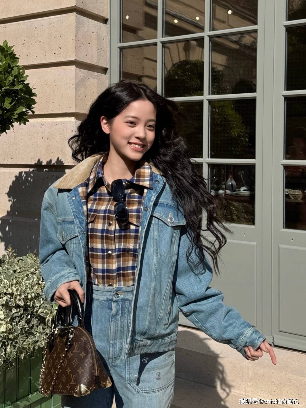 经典的英伦风格纹衬衫自带复古气息,配上水洗蓝牛仔套装,oversize外套和高腰牛仔裤大展随性风,搭配上LV老花包把复古主义拿捏住了。