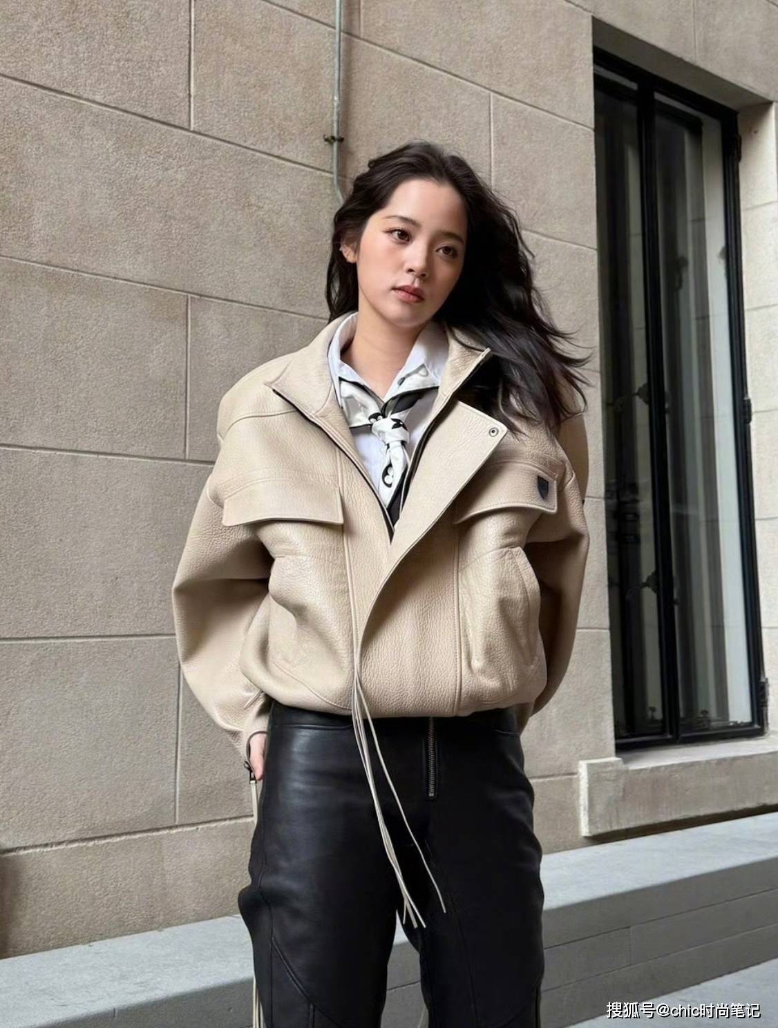 同样的白衬衫搭配上质感皮衣,整体的风格直接变了,米白色流苏皮衣设计感和质感绝佳,加以黑色修身款皮裤,又帅又A的熟女竟被轻松拿捏。