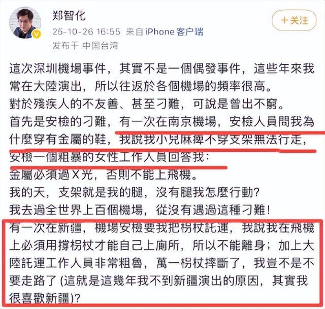 郑智化直言深圳机场的事件并非偶发,这些年因为经常到各地演出,类似的刁难经历层出不穷,还特意点名南京、新疆、上海、深圳四大机场,细数自己遭遇的种种不公。