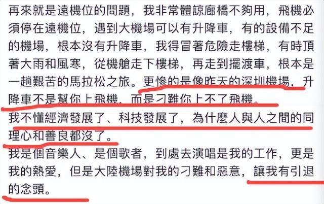 还透露,因为常年在机场遭遇类似刁难,自己甚至有了隐退的念头,毕竟作为歌手,频繁出差演出是常态,可这样的出行体验实在让人身心俱疲。