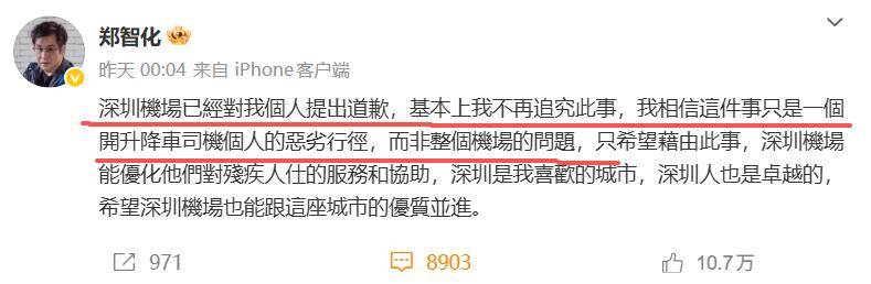 结果没过多久,深圳机场就针对此事作出回应,不仅向郑智化本人诚恳道歉,还公开表示会开展多项整改,优化残疾人出行服务流程。