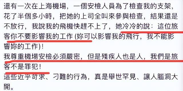 而在上海机场的经历,让他感觉很不被尊重,说安检人员在检查他的拐杖时,花费了半个多小时还没结束,期间还特意叫来了上司。