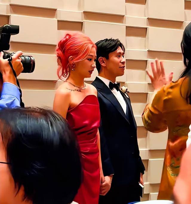 她染了一头粉色头发,穿着抹胸金色长裙,和新郎站在一起,接受着所有人的祝福。